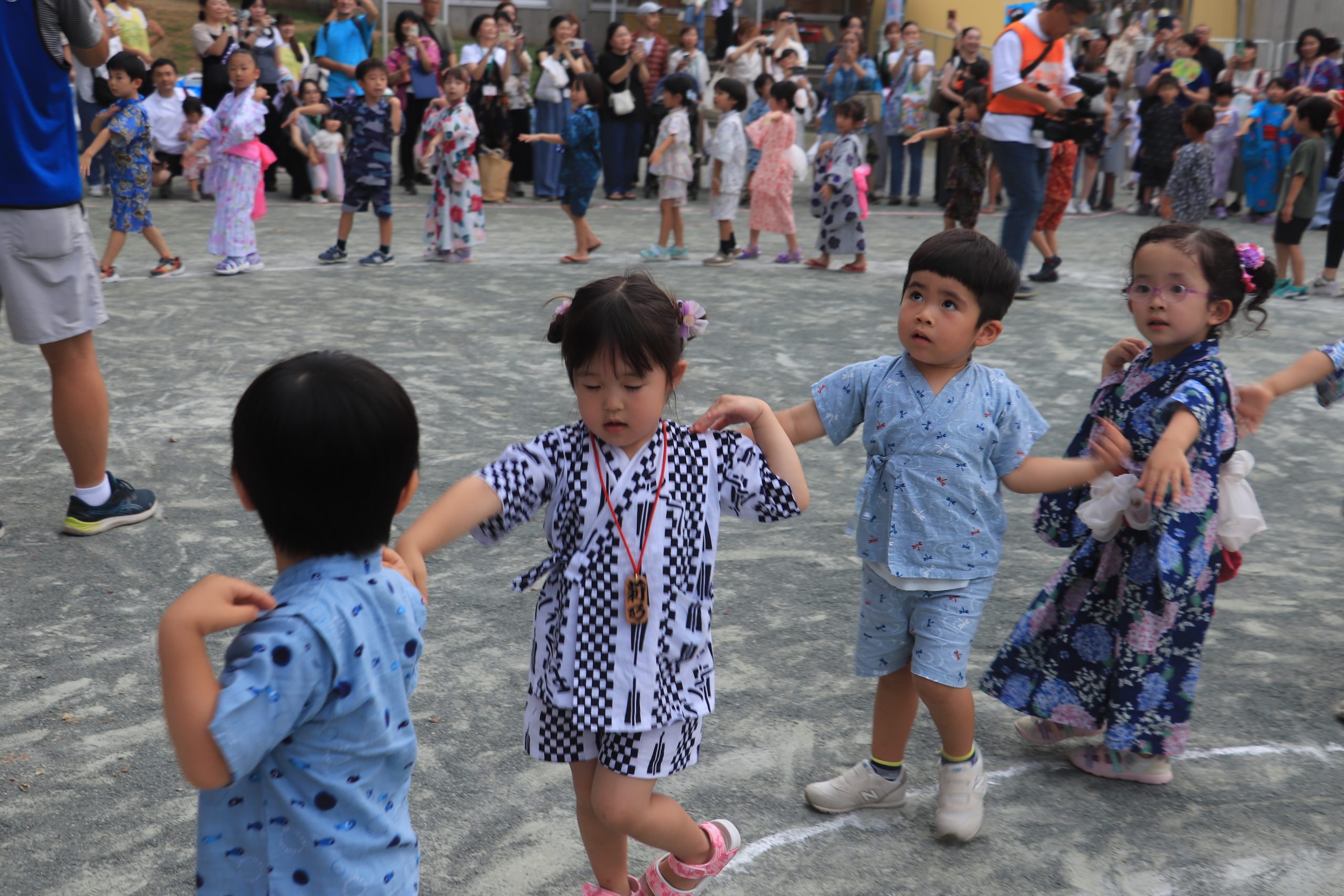 浴衣や甚平を着た可愛らしいお友達がワッショイ!ワッショイ!とおみこしを担ぎます。夏休み中に年長さんはお家の方と離れて初めてのお泊り!