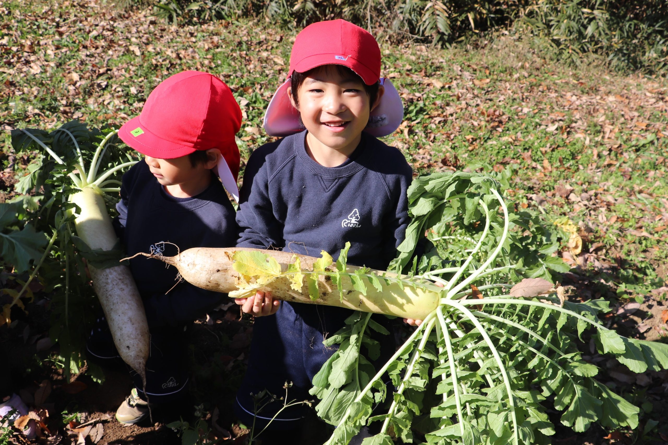 幼稚園の畑で育った大きな大根を、うんとこしょ、どっこいしょと抜きます。