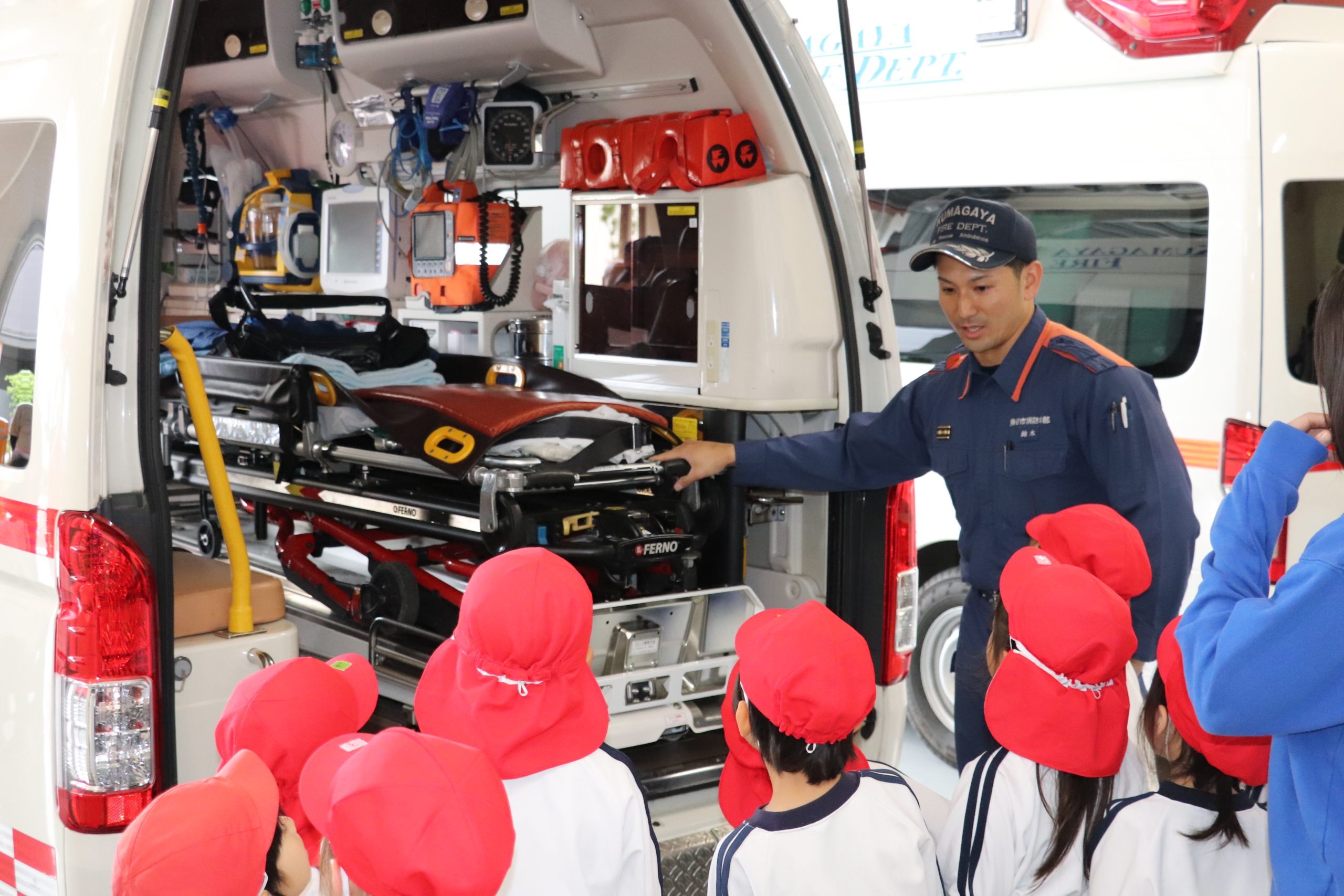 消防署へ見学に行きレスキューの様子や消防車の中を見せていただきます。
