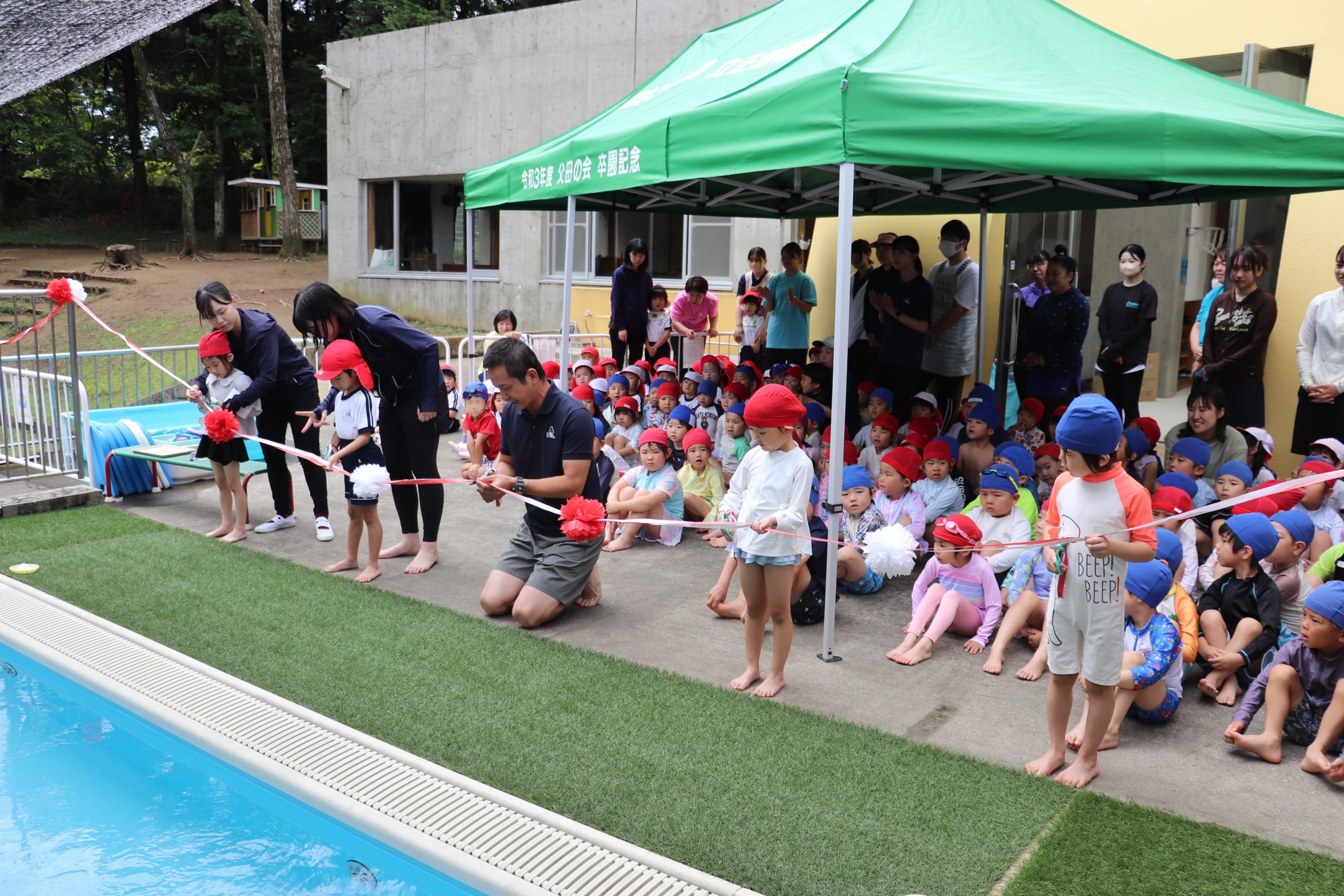 幼稚園の広いプールでみずあそびを楽しみます。